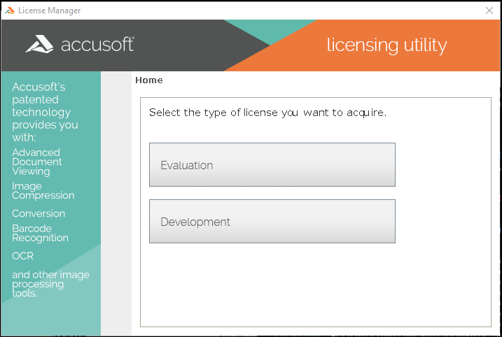 Once running, the License Manager will provide options for obtaining both Evaluation and Development licensing.