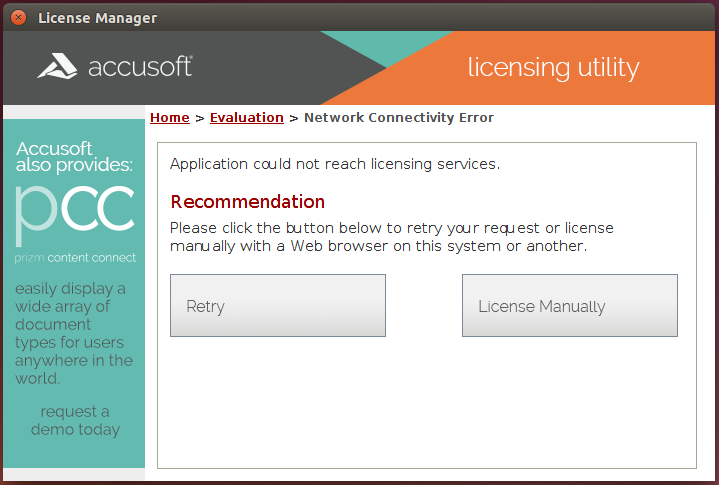 The Manual Licensing Process may only be started once the License Manager detects that a connection to the licensing services cannot be established. The connection is attempted when Request Evaluation is clicked on the main Evaluation screen.