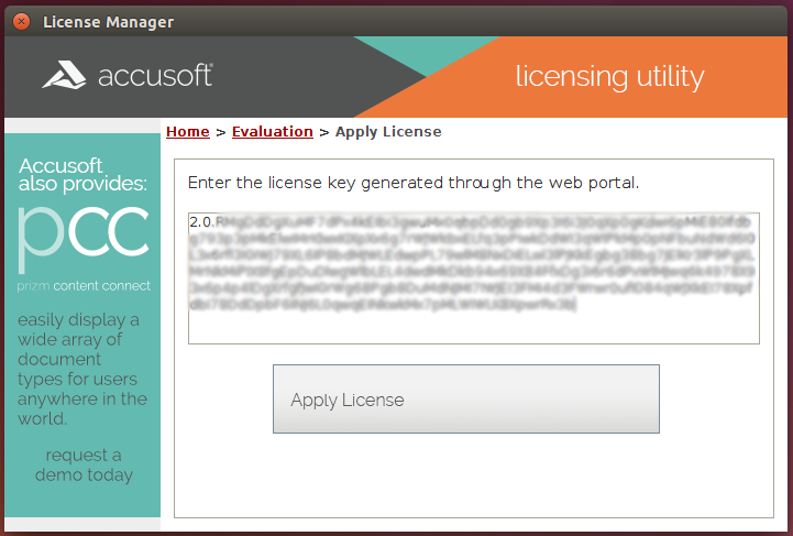 Once back to the License Manager running on your evaluation machine, you can paste the license information into the awaiting text area.