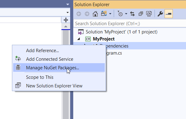 In Visual Studio, you can add the NuGet package as a dependency in the Manage NuGet Packages context menu option of your project in the Solution Explorer.
