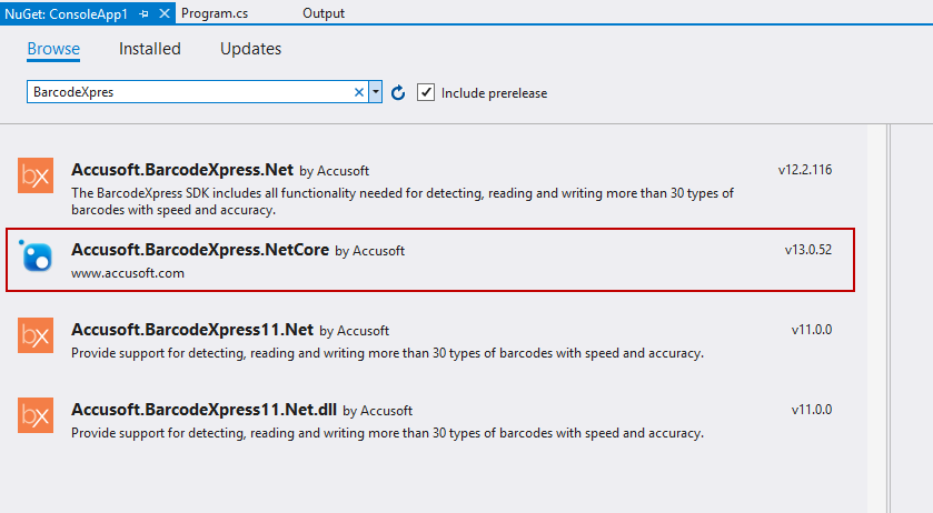 To let Visual Studio manage your Barcode Xpress dll, add the NuGet package to your project by browsing: