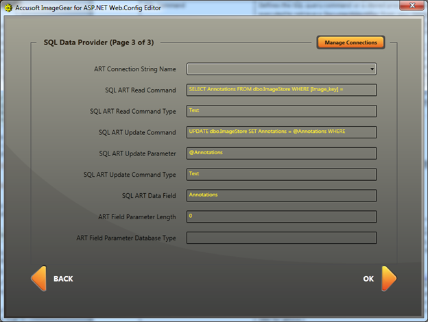 | SQL ART Data Field | Represents the database table field/column that holds the annotation data. If using the built-in SqlImageDataProvider, even when images are stored as files, the annotations data is expected to be stored as CLOBs (character large objects or VARCHAR(MAX) SQL data type). |