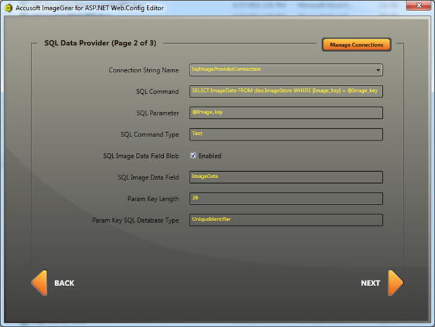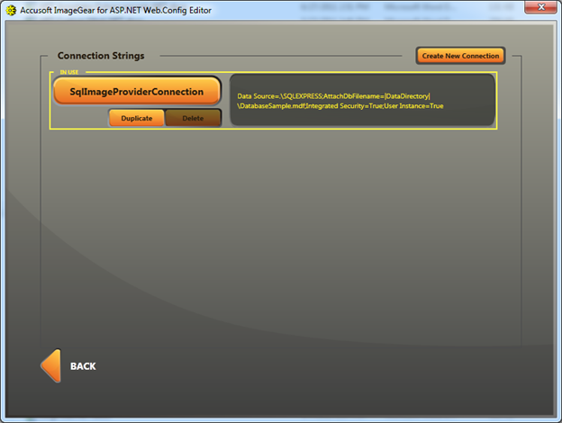 ImageGear for .NET User Guide > Using ImageGear for .NET > Using the ASP.NET Web.Config Editor Application for Configuring Your Web Application > How To Use the ASP.NET Web.Config Editor's Web Configuration Categories Screen > Configuring & Working with Data Providers > Creating New SQL Providers > Managing SQL Connection Strings