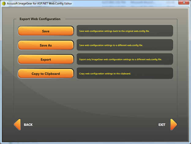 | Export | The option will only output the settings related to the ImageGear for .NET ASP.NET functionality. Other settings with the loaded web.config file will be dropped. |