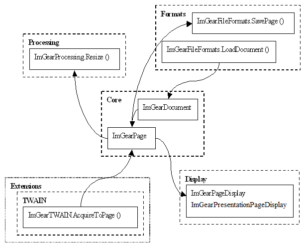 The ImageGear .NET library is logically divided into five major parts, encapsulated into following namespaces a Core, Processing, Formats, Display and extensions. An example of their relationship is shown in the following diagram: