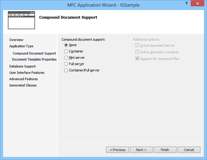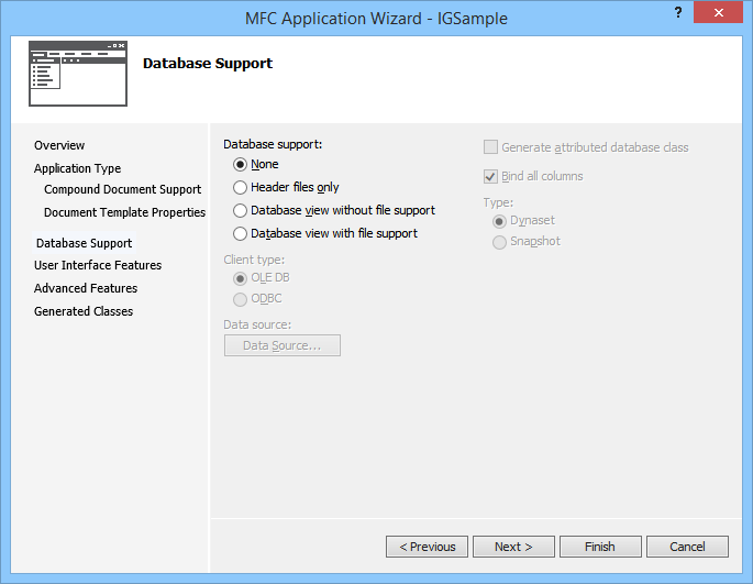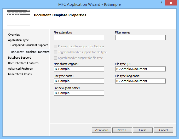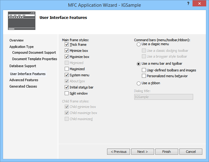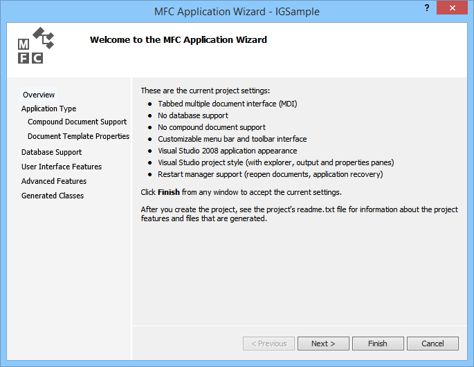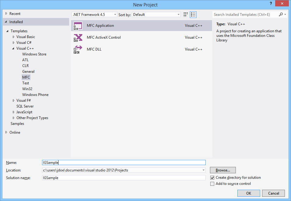 - Create a new MFC Application project. For this tutorial, the Project name is IGSample. Click OK after entering this Project name.