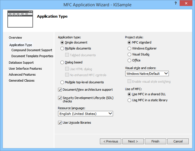 - On the Application Type dialog, choose the Single document option to create a Single Document Interface (SDI) application. Select MFC standard as the Project style. Click Next.