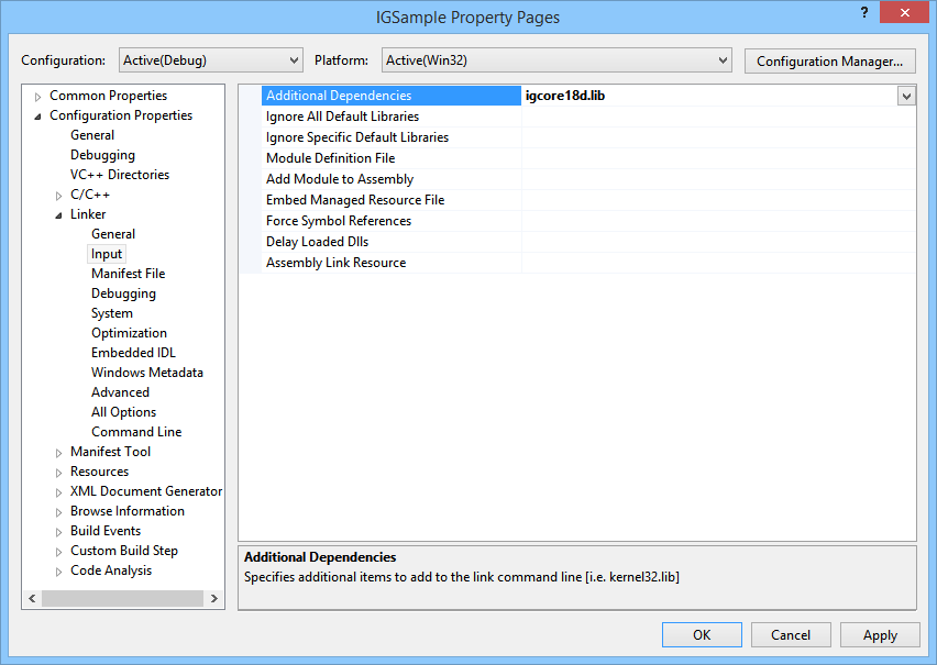 - Then select the Linker > Input option in the left panel, and add the name of ImageGear library file (igcore18d.lib) to the Additional Dependencies field in the right panel. Once you have done this, click OK.