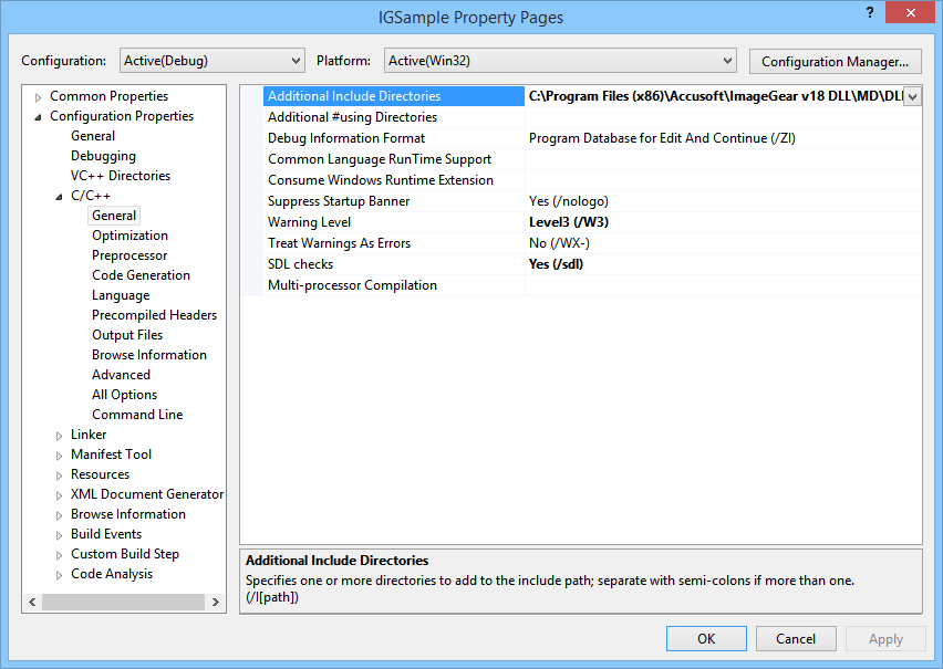 - In the right panel, add the path where you installed ImageGear into the Additional Include Directories field. For example, if you installed ImageGear to the path C:\Program Files (x86)\Accusoft\ImageGear v18 DLL\MD\DLL, then you will add the include directory in this path to the field (C:\Program Files (x86)\Accusoft\ImageGear v18 DLL\MD\DLL\Include).