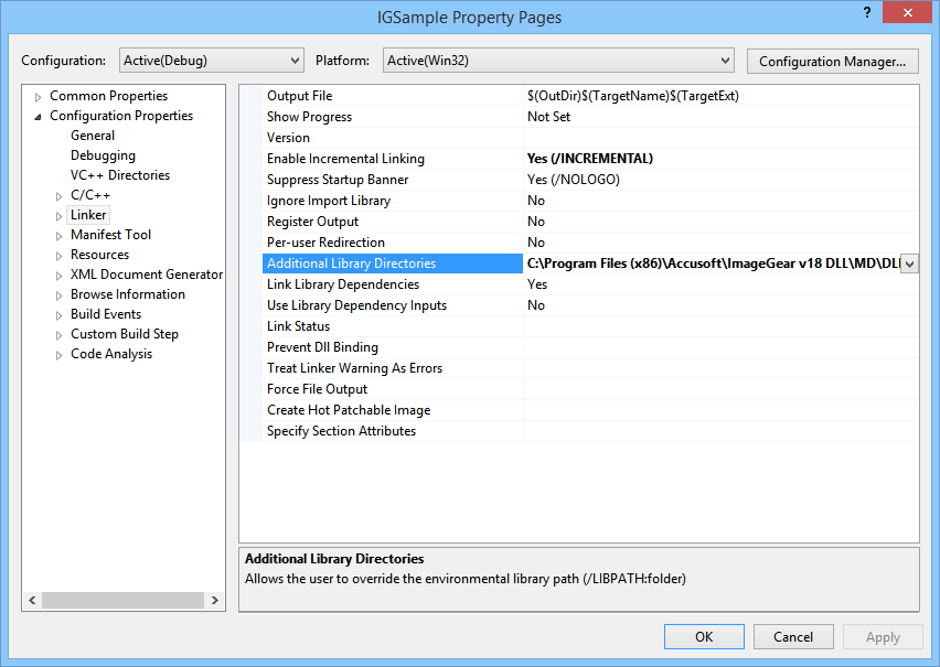 - Next select the Linker > General option in the left panel, and add a link to the ImageGear library folder (for example: C:\Program Files (x86)\Accusoft\ImageGear v18 DLL\MD\DLL\Lib) in the Additional Library Directories field.