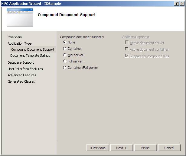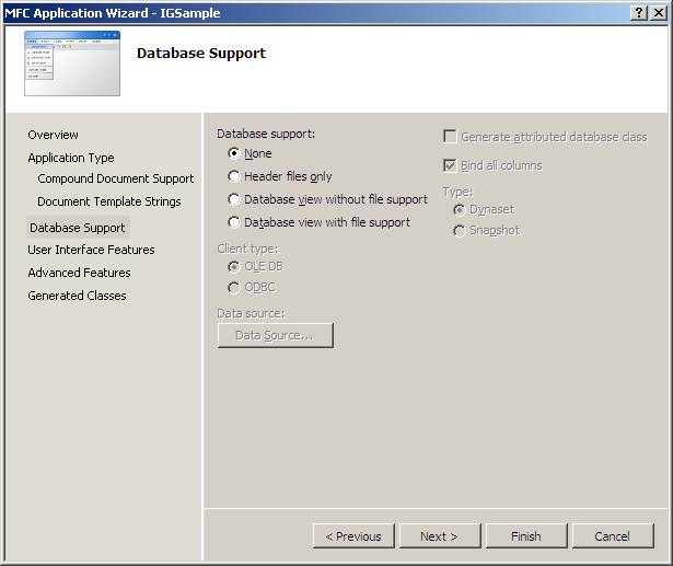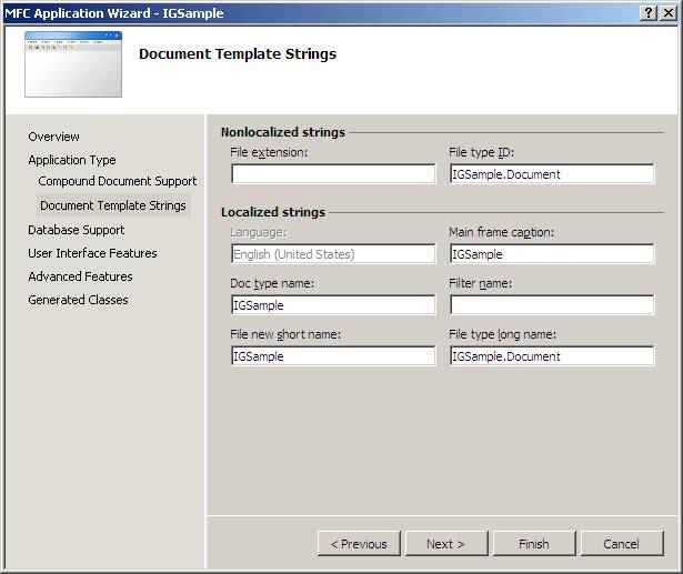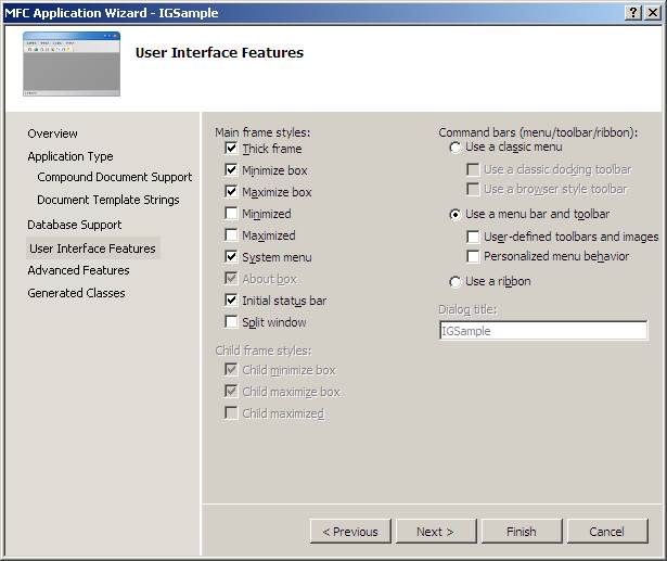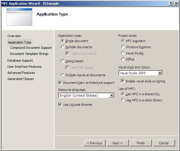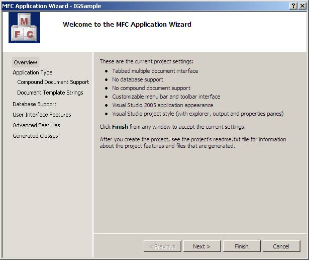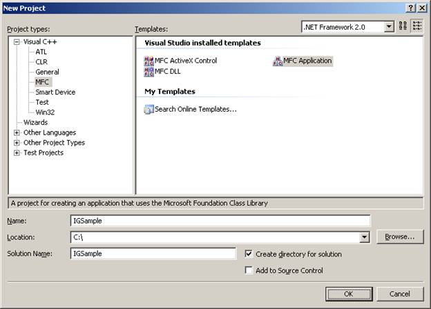 - Create a new MFC Application project. For this tutorial, the Project name will be called "IGSample". Click OK after entering this Project name.