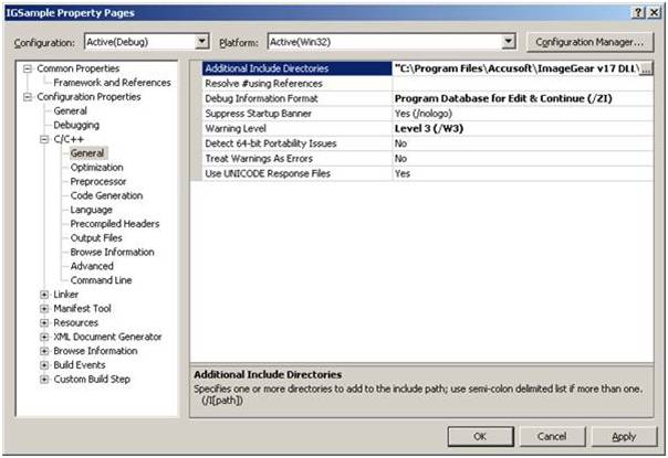 - In the right panel, add the path where you installed ImageGear into the field “Additional Include Directories”. For example, if you installed ImageGear to the path "C:\Program Files\Accusoft\ImageGear v18 DLL", then you will add the “include” directory in this path to the field ("C:\Program Files\Accusoft\ImageGear v18 DLL\Professional\DLL\Include").