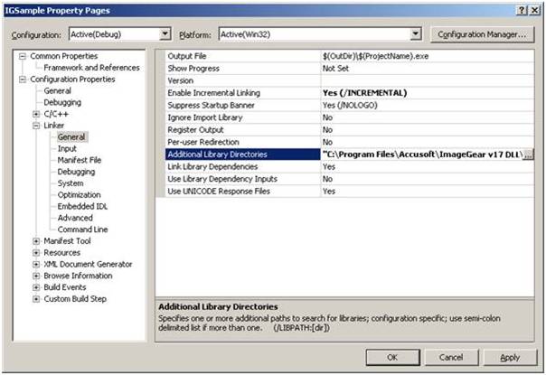 - Next select the Linker/General option in the left panel, and add a link to the ImageGear library folder (For example: "C:\Program Files\Accusoft\ImageGear v18 DLL\Professional\DLL\Lib") in the Additional Library Directories field.