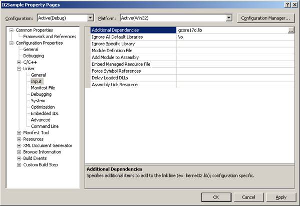 - Then select the Linker/Input option in the left panel, and add the name of ImageGear library file (igcore18d.lib) to the Additional Dependencies field in the right panel. Once you have done this, click OK.