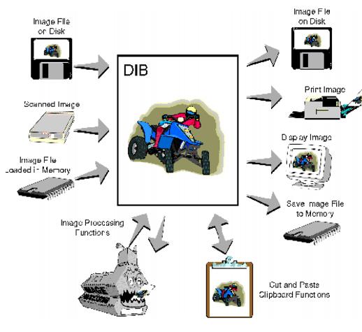 The diagram in figure 1 gives a conceptual view of the important role played by DIBs in ImageGear. The center image represents a DIB that results when an image is obtained from disk, memory, or a scanned file. Image processing and clipboard functions can be used to alter or merge the actual DIB bitmap data. To the right of the DIB are various routes an image may take after being manipulated by ImageGear: it may be saved to disk or to memory, it may be displayed, or it may be printed.