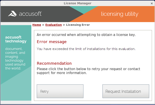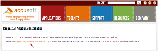 - Request an Additional Installation - Select this option to send a request to Accusoft Sales to add an additional installation for your Evaluation License. This will allow you to obtain an Evaluation License for a new machine. These requests are reviewed by Accusoft Sales staff, and are usually processed in approximately one business day.
