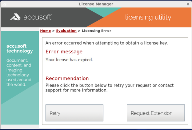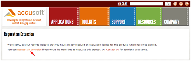 - Request an Extension - Select this option to send a request to Accusoft Sales to extend the evaluation period of your license. These requests are reviewed by Accusoft Sales staff, and are usually processed in approximately one business day.