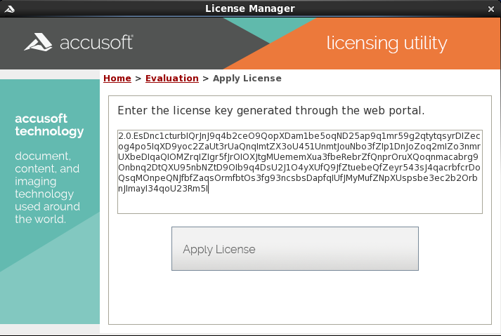 Once back to the License Manager running on your evaluation machine, you can paste the license information into the awaiting text area.