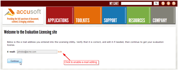 Once at the Evaluation Licensing website, the e-mail address you entered into the License Manager will already be pre-populated. If you notice an error in your e-mail address, you can correct it at this time by clicking the Edit link.