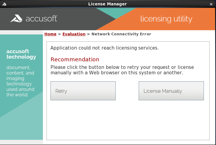 Click Retry if you are aware of an Internet connection issue that has been resolved. Otherwise, click License Manually to begin the Manual Licensing Process.