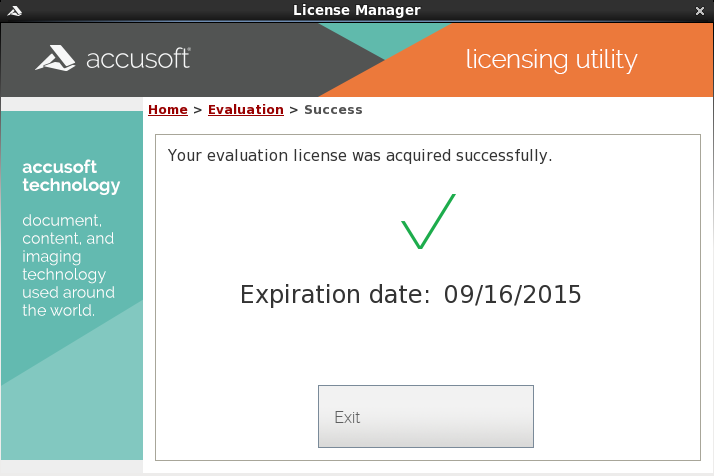 If your Evaluation License was acquired successfully, you should see the message below. Click Exit to quit the License Manager and begin your product evaluation. However, if a problem occurred during the licensing acquisition process, you may see an error. Please see Evaluation Licensing Troubleshooting for more information on resolving these potential problems.