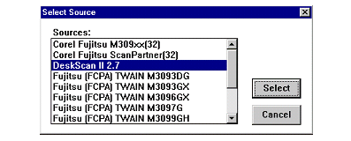 Before the application performs any scanning operation, the user is offered a list of available scanning devices from which to choose, in the event that there is more than one. IG_TWAIN_source_open() will display the TWAIN Select Source dialog box with a list of available scanning devices, as shown below: