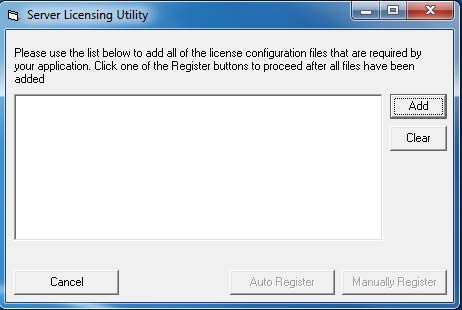 After all applicable License Configuration files have been added, click Auto Register or Manually Register, depending on whether or not you are connected to the Internet.