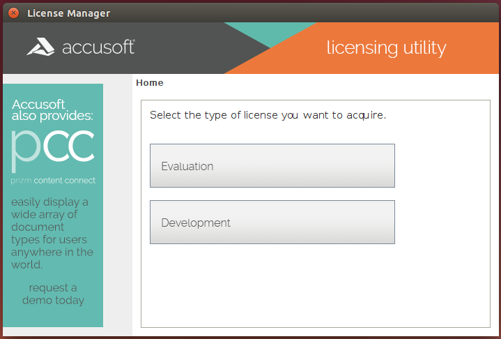 Once running, the License Manager will provide options for obtaining both Evaluation and Development licensing.
