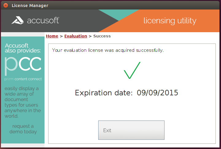 If your Evaluation License was acquired successfully, you should see the message below. Click Exit to quit the License Manager and begin your product evaluation. However, if a problem occurred during the licensing acquisition process, you may see an error. Please see Evaluation Licensing Troubleshooting for more information on resolving these potential problems.