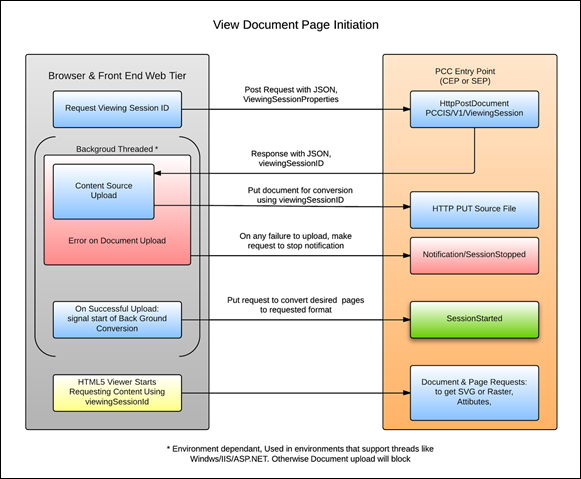 The Prizm Services architecture is based on a two-tier web solution where the SEP, or CEP, is the backend tier and the front end tier is a light-weight-pass-through tier keeping the customer’s web application simpler to implement the Prizm sSrvices. There is a slight cost to this approach in that source documents need to be uploaded from the front end web tier to the Prizm Services tier. The recommendation is to embed code into the web page to initiate the upload sequence of the document and start the Prizm Services preparing the document for viewing. Another caveat to consider is that the document identification needs to be supplied by Prizm Services so that it can better manage that resource once it is uploaded.