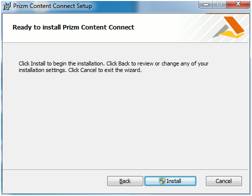 - The Ready to Install Prizm Content Connect dialog is the final configuration dialog that launches the installation process. To install the product with the defined settings, click the Install button.
