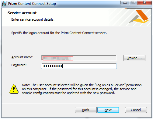 - The next step in the installation process allows you to define the account that will be used to run the Prizm Service that is installed on the system. The dialog will default to the user running the installation, but you can enter in a user name or use the Browse button to select a user from the local system or domain. Once a user has been selected, the password for the user account will need to be entered into the dialog.