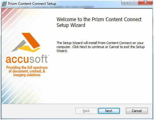 - The Custom Setup screen allows you to define what components of Prizm Content Connect you want to install.