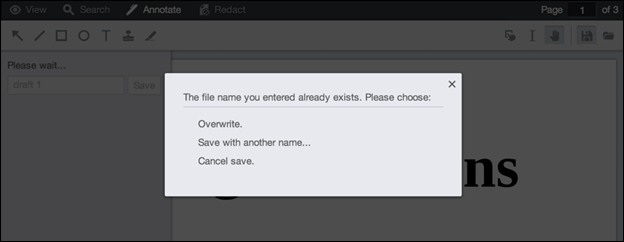 If you attempt to save annotations with a pre-existing file name, you will be prompted as shown below. To continue, select from one of the three available options: