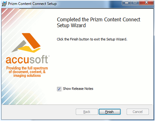 - After the Prizm Licensing Utility completes, the installer will continue setting up your system with Prizm Content Connect. Once the configuration is completed, a dialog will notify you that the installation is complete. There will be an option to launch the product release notes if you wish to view them directly after the installation. Click Finish to exit the Installer. You can view the status of the Prizm Platform Services by clicking 'Prizm Content Connect Admin Page' Under Prizm on the Start Menu or navigating to http://localhost:18681/admin in the browser.