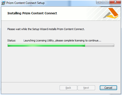 - About three-quarters of the way through the installation, the installer will launch the Prizm Licensing Utility. Follow the steps outlined in this utility to license the product for use. Please refer to the Prizm Licensing Utility instructions for help on obtaining a license.