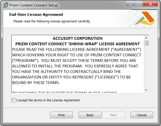 - Carefully read the information contained in the License Agreement form before making a decision to accept the terms of the agreement. Choose I accept the terms in the License Agreement to accept the conditions outlined in the License Agreement and then click the Next button to continue the installation, or click Cancel to exit the installation process.