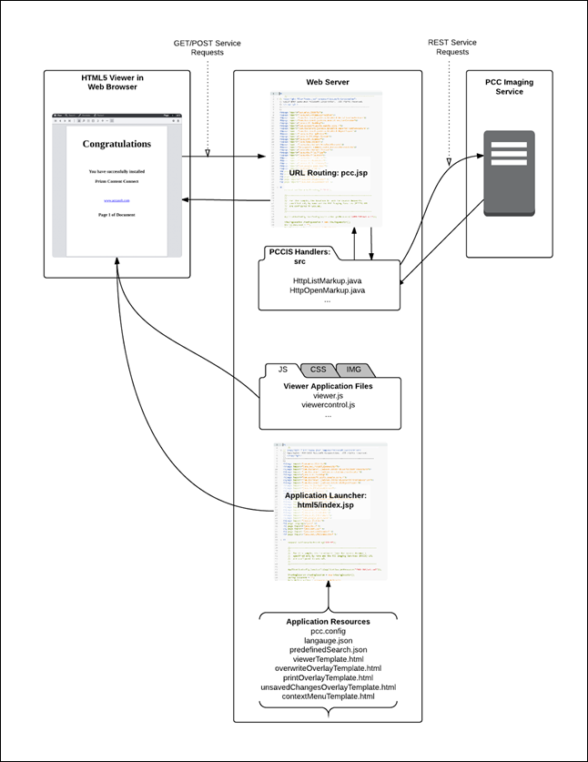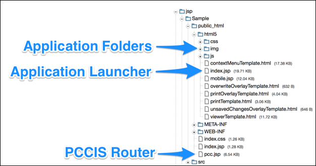 Another important file is pcc.jsp. This acts as a router between the front end Viewer and the Prizm Services. So pcc.jsp must be able to receive and respond to requests from the viewer. The sample places pcc.jsp one directory above the application launching index.jsp and informs the viewer of its location via the imageHandlerUrl parameter in index.jsp: