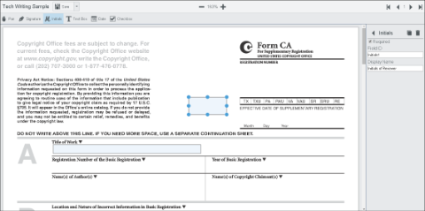 1. To add initials, click on the Initials button. Scroll to the location on the template you want to add the initials and draw a box.