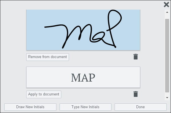 - Scroll to the initials you want to remove and click on Remove from document (this removes the initials from the document, but keeps them available to use again if you want).