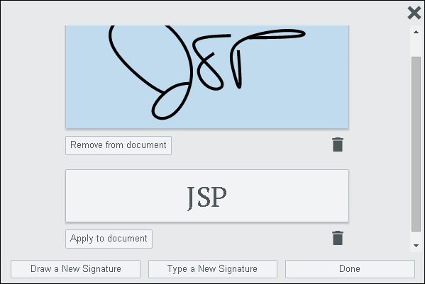 You can create both drawn and typed signatures to use throughout the document. You can also remove them from the document or delete them permanently and start over with new signatures. This section covers these options in detail.