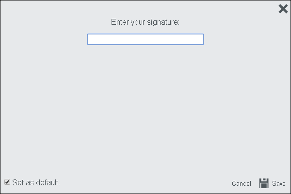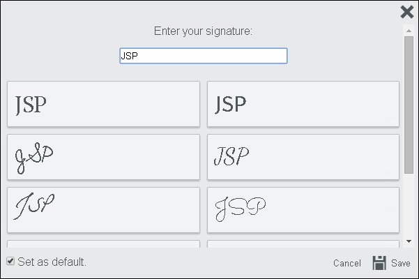 - You have the option to Set as default, Cancel or Save. Click on the signature you want and click Save. Your signature is placed in the Signature field.