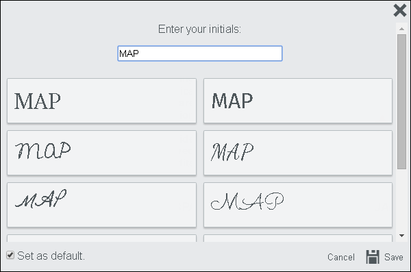 - Click on the initials you want and click Save. Your initials are placed in the Initials field.