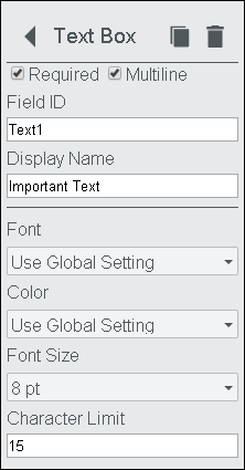 - Multiline Checkbox - select the checkbox to allow the end user to enter multiple lines of text in the text box (the Font Size drop-down will display when you select this checkbox so you can choose the exact font size you want displayed in the multiple lines of text)