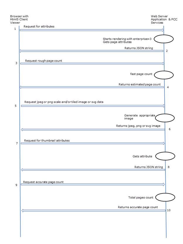 1. The client viewer requests for the document’s first page attributes (pages start at 0), which include page dimensions, bit depth, resolution, and possible image returned types. The request will trigger all pages in the document to be cached on the server if not already there.