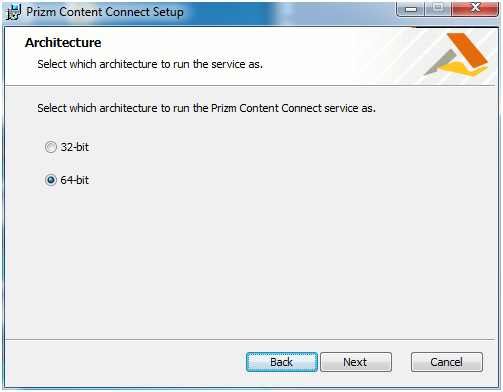 5. [64-bit Only] If you are installing Prizm Content Connect on a 64-bit system, you will have the option to select the Architecture for your system. Once you have selected an architecture, click the Next button to proceed.