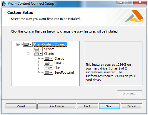 8. The Custom Setup screen allows you to define what components of Prizm Content Connect you want to install.