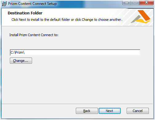 4. After clicking Next, the Destination Folder form is displayed. Specify the destination directory where the Prizm Content Connect product should be installed or choose the default installation destination directory. Then click Next