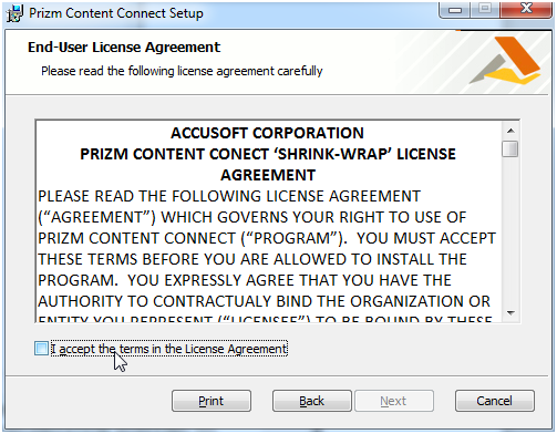 3. Carefully read the information contained in the License Agreement form before making a decision to accept the terms of the agreement. Choose I accept the terms in the License Agreement to accept the conditions outlined in the License Agreement and then click the Next button to continue the installation, or click Cancel to exit the installation process.
