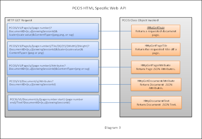 As can be seen from the following diagrams 3, 4, and 5, the left side container box denotes the URL and verbs needed to access the PCCIS handler objects noted on the right side inside the PCCIS services web tier: